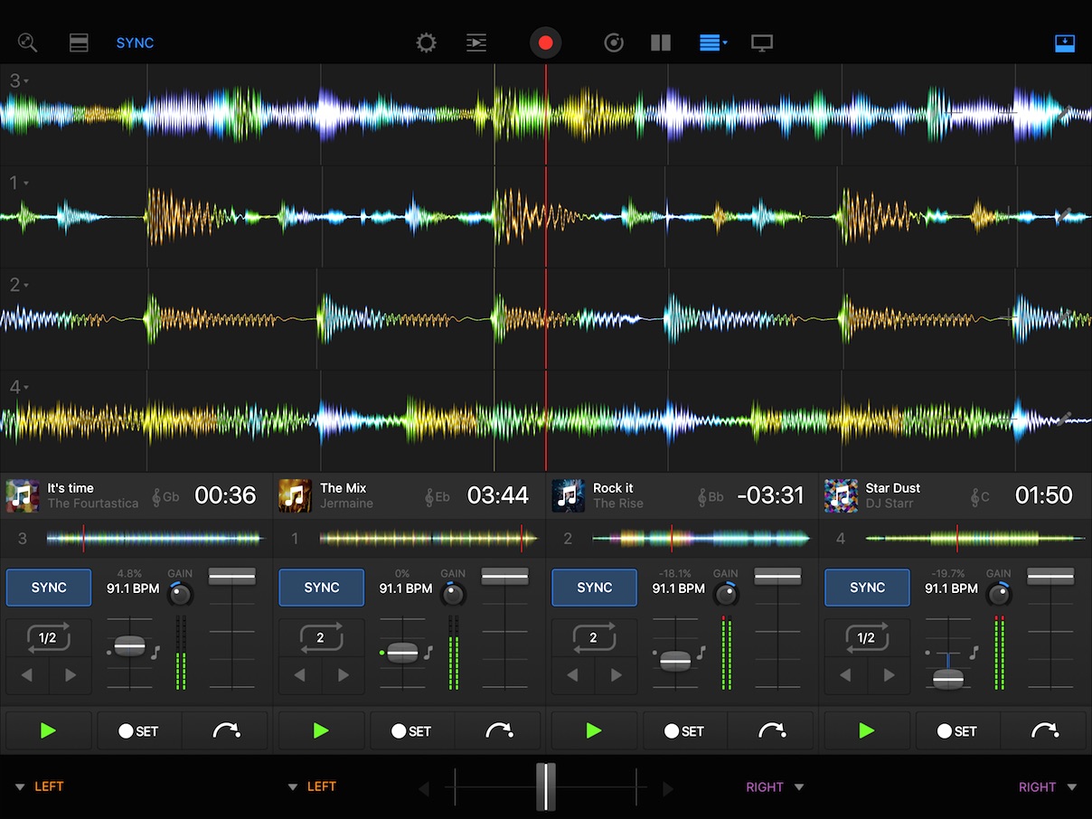 En la parte superior de la aplicación ipad dj verás pequeñas formas de onda como en aplicaciones anteriores Algoriddim, los ajustes y los menús de mezcla automática, un botón de grabación , y una selección de puntos de vista.